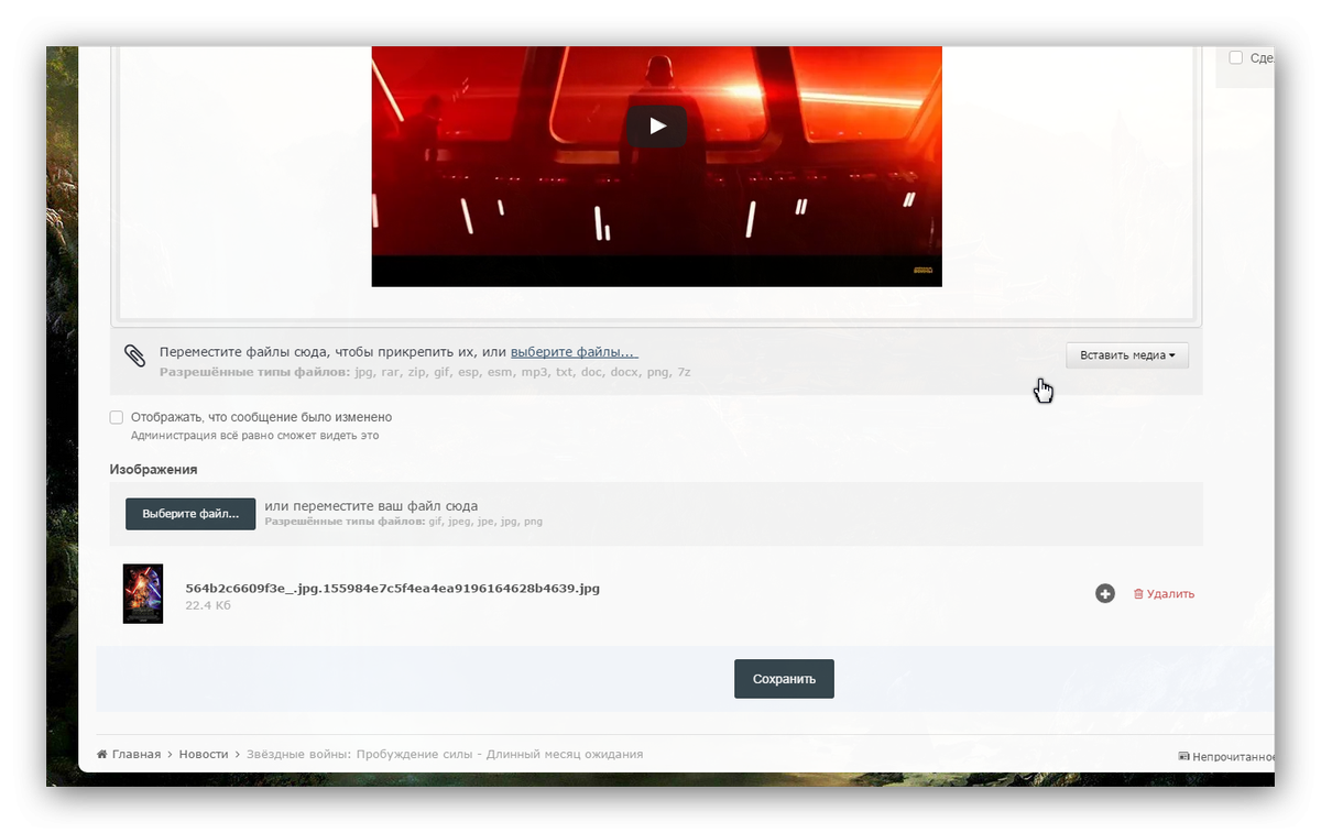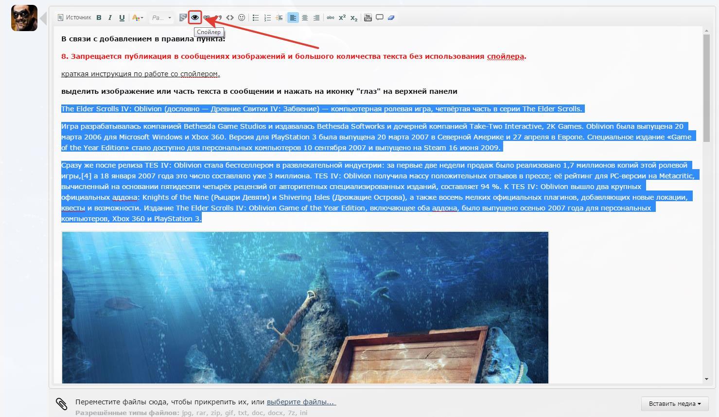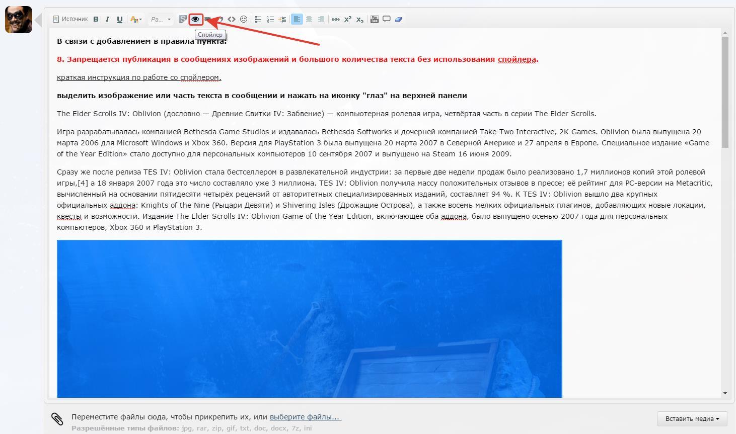 Rubicon Опубликовано 17 ноября, 2015 Автор Опубликовано 17 ноября, 2015 Чтобы прикрепить картинку к новости, нужно вставлять её не в тело поста с текстом и прочим, а ниже, как на скрине будет отдельное поле: Чтобы видео и текст отображались нормально, когда Вы его копируете с другого ресурса в интернете, нужно выделять ТЕКСТ и нажимать на Синий Ластик в панели иконок, как описано Выше в посте о БЛОГЕ! Затем поправить текст как вам нужно. 1
